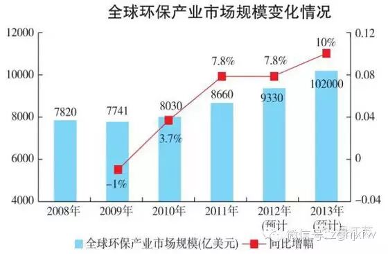 環(huán)保產(chǎn)業(yè)方面,據(jù)美國環(huán)境商業(yè)國際公司(EBI)統(tǒng)計,2011年全球環(huán)保產(chǎn)業(yè)市場規(guī)模達(dá)8660億美元,預(yù)計2013年全球市場規(guī)模將達(dá)約1.02萬億美元。國際金融危機(jī)以來,全球環(huán)保產(chǎn)業(yè)規(guī)模增速一路攀升,由2009年的-1%提高至2013年的10%。