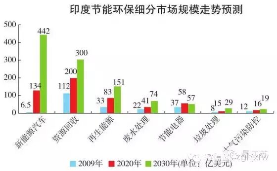 印度節(jié)能環(huán)保市場增長強(qiáng)勁,其中,新能源汽車市場規(guī)模將由2009年的6.5億美元增至2020年的134億美元;資源回收產(chǎn)業(yè)市場規(guī)模將由2009年的112億美元增至2020年的200億美元;再生能源市場規(guī)模將由2009年的33億美元增至2020年的83億美元。