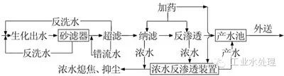 生化系統(tǒng)出水進入深度處理系統(tǒng)調(diào)節(jié)池,調(diào)節(jié)水質(zhì)和水量后經(jīng)泵提升進入砂濾設(shè)備去除懸浮物,產(chǎn)水進入砂濾產(chǎn)水池。砂濾產(chǎn)水提升后經(jīng)過自清洗過濾器進入超濾設(shè)備去除膠體等污染物,超濾產(chǎn)水進入超濾產(chǎn)水池。在超濾產(chǎn)水提升的同時投加還原劑、阻垢劑、非氧化性殺菌劑,經(jīng)過高壓泵增壓進入納濾系統(tǒng)去除硬度、二價鹽離子等污染物,納濾產(chǎn)水進入納濾產(chǎn)水池。在納濾產(chǎn)水提升的同時投加阻垢劑、非氧化殺菌劑,經(jīng)高壓泵增壓后進入反滲透系統(tǒng)進一步去除離子等污染物,反滲透產(chǎn)水進入回用水池待用。砂濾、超濾反洗水經(jīng)反洗水池調(diào)節(jié)后進入生化系統(tǒng)混凝反應(yīng)池,在系統(tǒng)內(nèi)循環(huán)處理。為提高系統(tǒng)回收率,對反滲透濃水進行二次過濾,進一步減少系統(tǒng)外排水量。