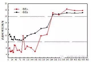 3為污泥A和污泥B內(nèi)源呼吸比例的變化,在曝氣培養(yǎng)的初始階段內(nèi)源呼吸比例均維持在低水平階段,隨著曝氣進(jìn)行,內(nèi)源呼吸比例快速上升,最后維持在高水平階段。根據(jù)內(nèi)源呼吸比例的變化,內(nèi)源呼吸過程也呈現(xiàn)三個明顯的區(qū)域特征,分別為內(nèi)源呼吸比例低平穩(wěn)區(qū)(比例低于8%)、高效代謝區(qū)(比例在8%-16%之間)和高平穩(wěn)區(qū)(比例高于16%).