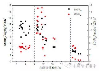 采用呼吸圖譜技術(shù)對傳統(tǒng)市政活性污泥和垃圾滲濾液活性污泥呈現(xiàn)出的內(nèi)源呼吸特征的分析,得出污泥進(jìn)入內(nèi)源呼吸的時刻與污泥的類型和污泥齡有關(guān),而污泥進(jìn)入休眠期的時刻可能與污泥的類型和污泥齡無關(guān)。根據(jù)內(nèi)源呼吸比例的變化特征,內(nèi)源呼吸過程可分為低平穩(wěn)區(qū)、高效代謝區(qū)和高平穩(wěn)區(qū)三個區(qū),運(yùn)行良好的污水處理廠一般處于高效代謝區(qū),對常規(guī)污水處理廠而言,該區(qū)域?qū)?yīng)的內(nèi)源呼吸比例為8%-16%
