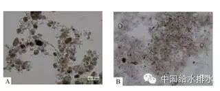 污泥A與污泥B在形態(tài)上有較大差異,如圖6所示。污泥A表現(xiàn)為微生物緊密聚集,形成較小的污泥聚集體,污泥更加密實(shí),該污泥雖具有較好的沉淀性能,但曝氣池泡沫嚴(yán)重。污泥A盡管污泥齡長,但其內(nèi)源呼吸比例維持在3.54%~6.46%之間,低于傳統(tǒng)活性污泥最低健康比例值8%,該廠由于進(jìn)水濃度高,曝氣池在污染物降解過程中熱效應(yīng)明顯,甚至需要開啟冷卻塔才能達(dá)到活性污泥正常運(yùn)行水溫條件,由此可見,該廠運(yùn)行條件已超出常規(guī)活性污泥法。上述結(jié)果表明,本研究定義內(nèi)源呼吸比例8%~16%為健康代謝區(qū),適用于常規(guī)的活性污泥法,對于其它工藝或特殊條件下的運(yùn)行還需要進(jìn)一步的研究。
