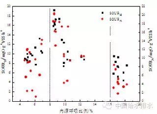 通過投加不同基質(zhì)來實(shí)現(xiàn)不同菌種呼吸速率的測定。為進(jìn)一步進(jìn)行研究,定義內(nèi)源呼吸比例為內(nèi)源呼吸速率占總呼吸速率的比例,即OURen/OURT 。