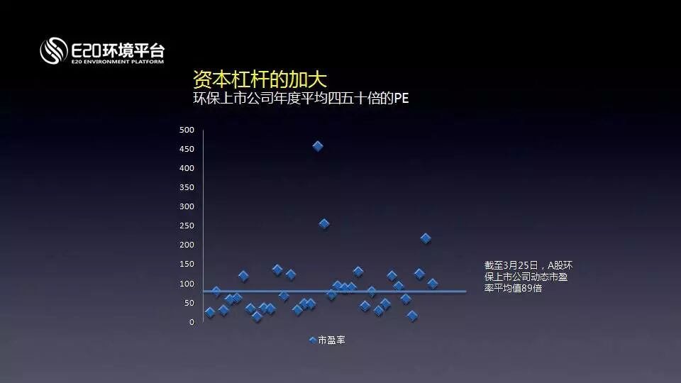 資本杠桿加大。環(huán)保上市公司年度平均四五十倍的PE,隨著一系列利好政策的推動,資本市場給了更高的估值。現(xiàn)在資本在給我們50倍以上PE在不斷的輸血,融資成本比內(nèi)生式的要低很多。