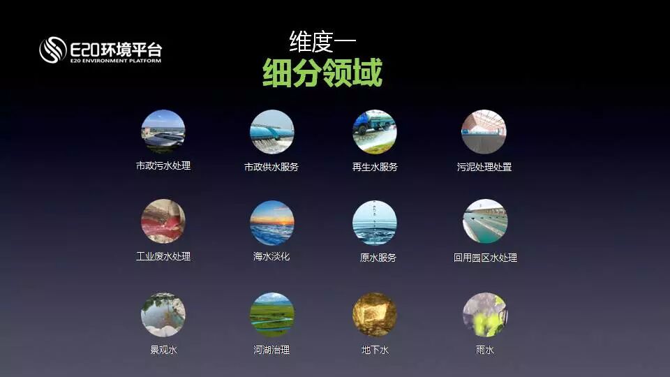 第一個維度------水務(wù)行業(yè)的12個細分領(lǐng)域。包括市政污水處理、市政供水服務(wù)、再生水服務(wù)、污泥處理處置、工業(yè)廢水處理、海水淡化、原水服務(wù)、回用園區(qū)水處理、景觀水、河湖治理、地下水、雨水及管網(wǎng),這些領(lǐng)域并不完全是特許經(jīng)營的領(lǐng)域,但都是公共服務(wù)的領(lǐng)域。