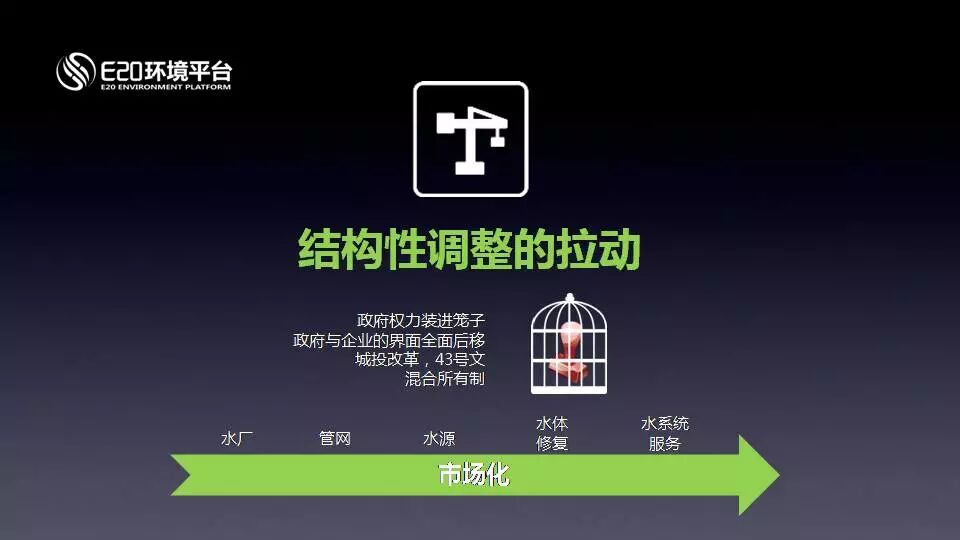 結(jié)構(gòu)性調(diào)整的拉動。源于地方缺錢和經(jīng)營城市的沖動,雖然時斷時續(xù),但是這個方向是可以肯定的。把原來政府事業(yè)單位自己干的活,讓企業(yè)來做,進行混合所有制改革,把原來事業(yè)型服務(wù)的變成產(chǎn)業(yè)化,都屬于結(jié)構(gòu)性拉動。結(jié)構(gòu)性拉動是因為地方缺錢,不同于英國市場化改革是因為效率和政治因素,而中國水務(wù)改革,絕大部分是因為地方政府缺錢,要把水務(wù)公司賣了,存量變增量。