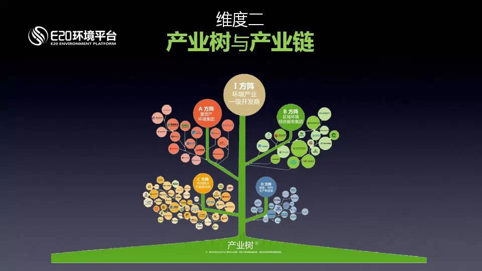 第二個維度-----關(guān)于產(chǎn)業(yè)樹和產(chǎn)業(yè)鏈。2014年,E20研究院發(fā)布的戰(zhàn)略地圖系列,完整定位出了中國環(huán)境產(chǎn)業(yè)內(nèi)ABCD四大方陣企業(yè)。我們是想表達面臨資本市場的熱烈追逐,不僅從細分領(lǐng)域,也從產(chǎn)業(yè)業(yè)態(tài)上來分析一下未來的前景。今年,E20研究院啟動了《環(huán)境產(chǎn)業(yè)戰(zhàn)略地圖》的修訂工作,發(fā)布了2.0版的戰(zhàn)略地圖:預(yù)示了I方陣(環(huán)境產(chǎn)業(yè)一級開發(fā)商)即將形成的趨勢,從而詮釋產(chǎn)業(yè)樹概念。