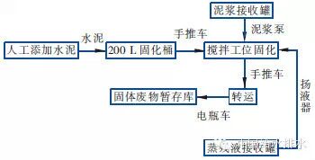 根據(jù)《放射性廢物安全管理條例》,核技術(shù)利用單位應(yīng)當對其產(chǎn)生的不能凈化排放的放射性廢水進行處理,轉(zhuǎn)變?yōu)榉派湫怨腆w廢物。低放射性廢水處理設(shè)施中原水泥固化系統(tǒng)是一條較為完整、復(fù)雜的生產(chǎn)線,工藝自動化程度較高,但由于建筑條件的限制和每年的固化量比較少,后對其進行了簡化(見圖5)。