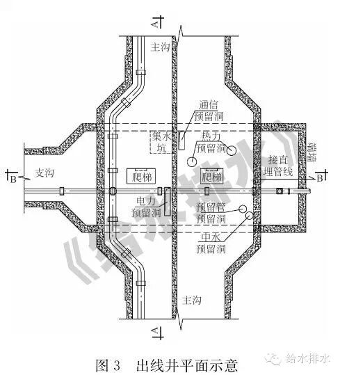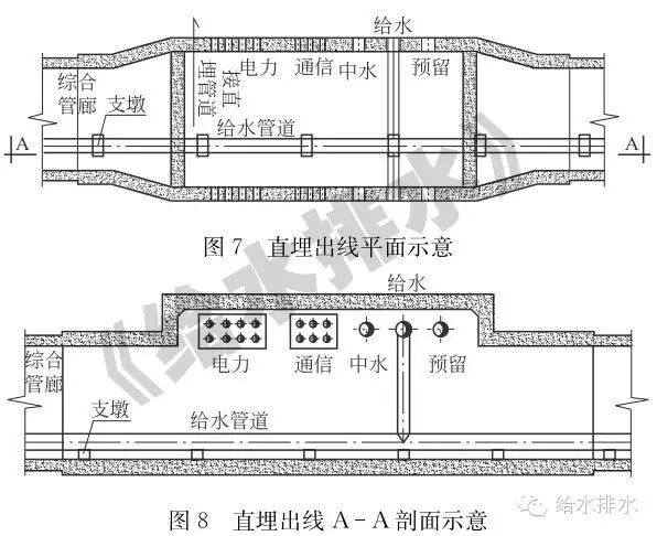 并非所有道路均設(shè)置綜合管廊,在路口或者間隔一定距離,綜合管廊內(nèi)管道需與外部相交道路或者用戶直埋管道進行銜接,從而帶來內(nèi)部多種管道的相互交叉及出線問題。管道交叉點和出線既是設(shè)計的重點,也是設(shè)計的難點,但其重要性只有在內(nèi)部管道安裝時,方能逐步顯現(xiàn)出來。目前,通常有支溝出線和直埋出線兩種方式完成管道的交叉和出線。