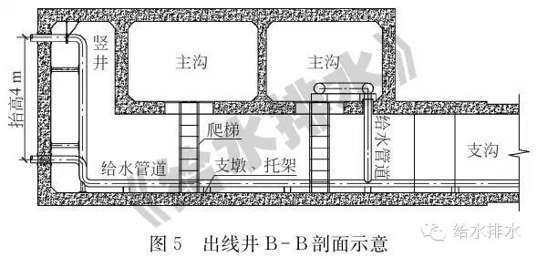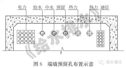 各專業(yè)管道主要通過出線井支溝的端墻與外部管道進行銜接。以往設(shè)計中,管道通常從支溝底層直接出溝,由于支溝覆土已超5m,管道出線處甚至在6m左右,用戶管道在與綜合管廊管道銜接時,挖深大、影響范圍廣,給外部管道銜接帶來極大困難。為解決上述弊端,主要進行了以下兩點改進:①于靠近出線井一側(cè)設(shè)置出線豎井(5),通過豎井來提高管道出線高度,使管道出線時覆土降低約2m,減少了外部管道銜接時的開挖深度和對周邊的影響,同時降低了防水難度;②端墻處提高預(yù)留孔口位置,將所有管道一字排列于端墻頂部,避免管道豎向重疊,減少后期開挖量(見圖6)