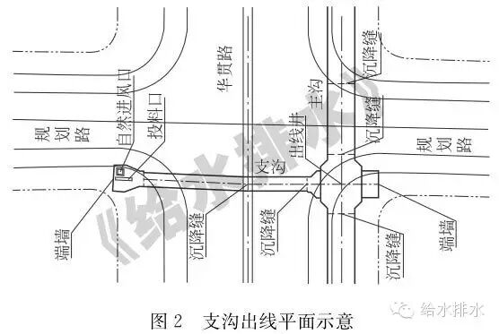 支溝出線優(yōu)點為支溝既解決管道交叉問題,同時也可作為過路綜合管廊,避免以后因新設(shè)或維修管道所帶來的掘路現(xiàn)象;缺點為工程投資高,施工周期長,影響范圍廣。因此支溝出線主要適用于同時新建道路和管道時選用。