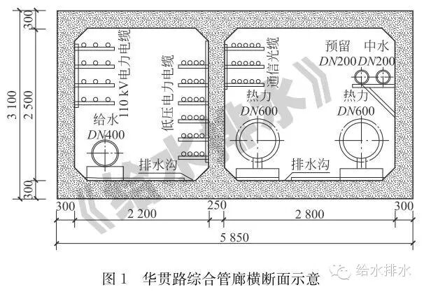 綜合管廊作為城市地下管道的集中載體,已逐步在全國各大城市得到應(yīng)用。但在使用過程中經(jīng)常出現(xiàn)溝內(nèi)管道交叉混亂、用戶管道與溝內(nèi)管道銜接困難以及主體漏水等現(xiàn)象。在對華貫路綜合管廊設(shè)計時,重點優(yōu)化和加強了內(nèi)部管道交叉、結(jié)構(gòu)防水、附屬工程安裝空間預(yù)留等設(shè)計,為綜合管廊后期使用提供了良好環(huán)境。