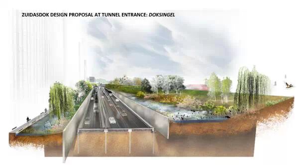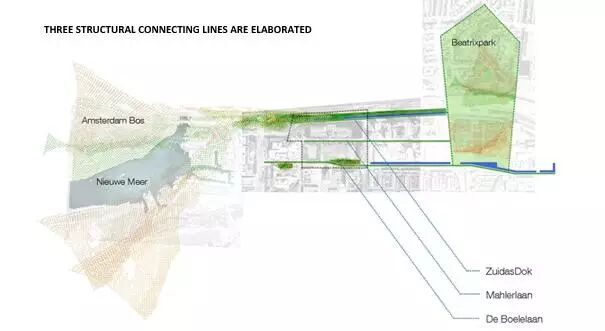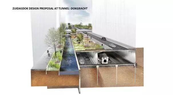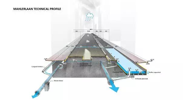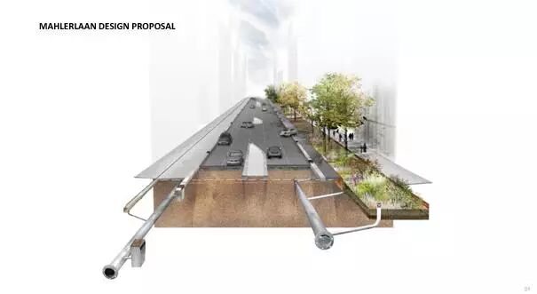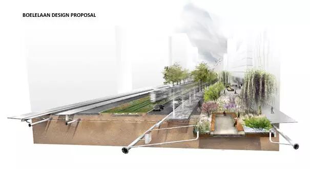 設(shè)計方案包括3個防水的基礎(chǔ)設(shè)施長線和2個特殊的空間。對于這5個介入空間,事務(wù)所把對公共區(qū)域質(zhì)量的改善和雨水緩沖容量增加的工作結(jié)合了起來。尤其在3條長線里,事務(wù)所把它們與公共空間的大量綠化和軟化結(jié)合了起來:Boelelaan、Mahlerlaan、Zuidasdok。最后一個是很具有策略性的:它把鹿特丹南部環(huán)形通道A10的隧道與整個南軸線的水系統(tǒng)的結(jié)構(gòu)改善工作結(jié)合起來設(shè)計。
