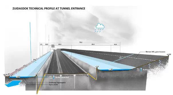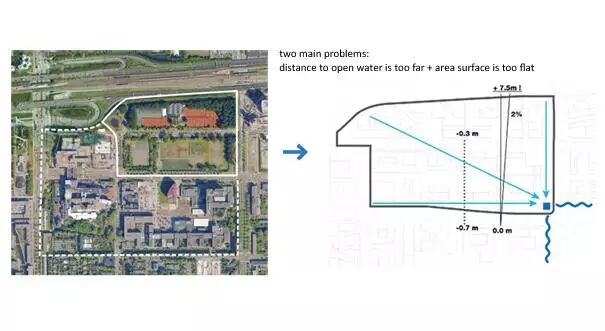 鹿特丹南軸線(澤伊達斯)是荷蘭最有聲望的城市再發(fā)展區(qū)域。高品質(zhì)的公共空間、高端建筑水平的辦公室以及高密集的城市空間。在這些高標(biāo)準(zhǔn)之下,雨水的排放就沒有了太多的優(yōu)越性。所以當(dāng)暴雨來臨,問題就開始升級,因為地下系統(tǒng)不能盡快的解決所有的水,確保道路是干的,讓走在道路的普拉達鞋不受到損害。