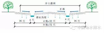 道路設(shè)計(jì)的具體方法早在兩千多年前便有詳細(xì)記載。在《周禮·地官司徒·遂人》、《周禮·冬官考工記·匠人》中,規(guī)定了不同道路等級(jí)的布局、寬度,并配置相應(yīng)的排水、綠化。賀業(yè)鉅根據(jù)《考工記·匠人》擬繪制了經(jīng)緯涂(城市主要干道)剖面圖,如圖1所示。其斷面形式和大尺寸的邊溝設(shè)計(jì)明顯蘊(yùn)含了對暴雨排放的考慮,說明了道路排水是古城鎮(zhèn)道路系統(tǒng)規(guī)劃設(shè)計(jì)中重要的考慮因素和組成部分,且與道路本身緊密結(jié)合。