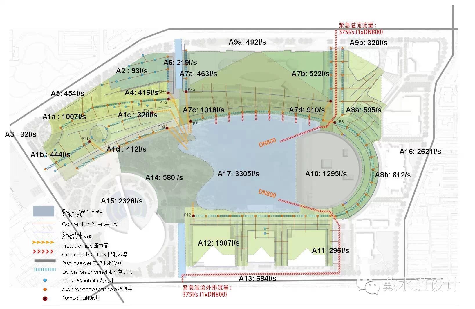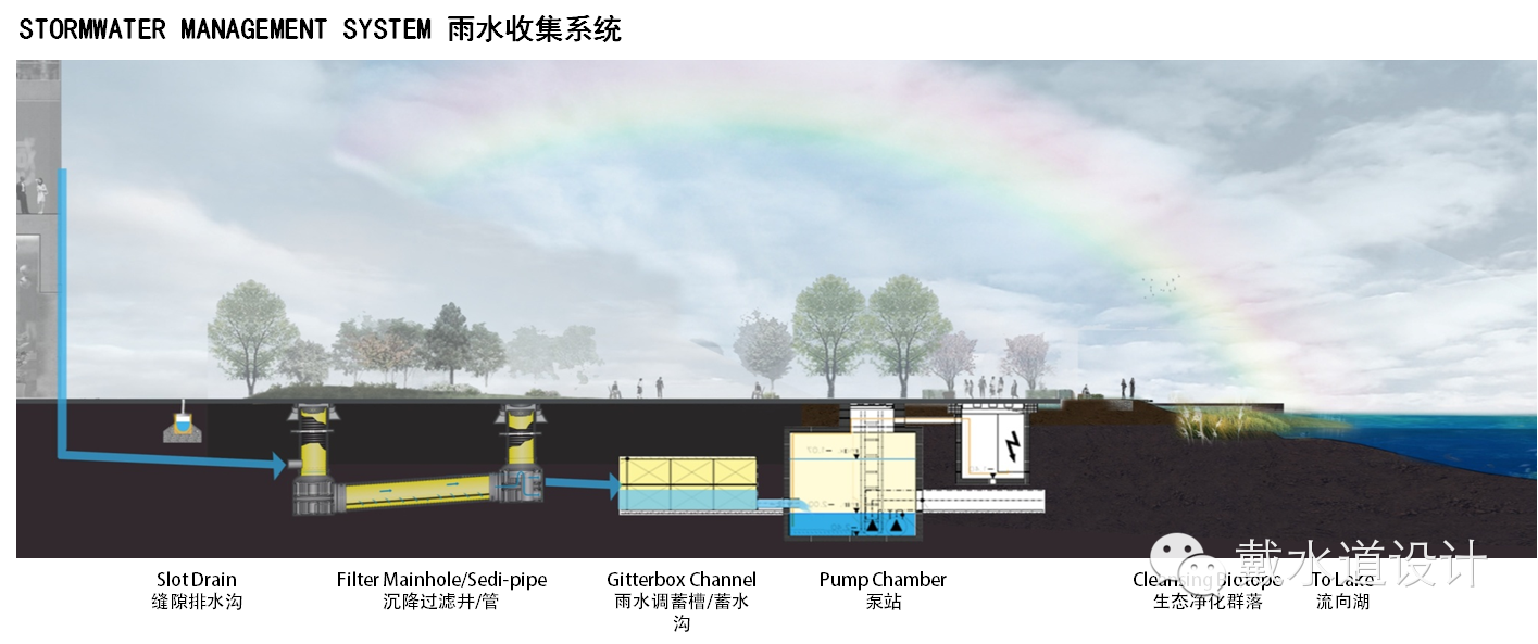 基于提升雨洪應對能力的重要性和迫切性,文化中心的雨水排水系統(tǒng)設計標準需要合理提高。在這種形勢下,一套具有雨洪收集、預處理凈化、調蓄和強排結合的綜合排水防澇系統(tǒng)經過多輪論證后被采納。