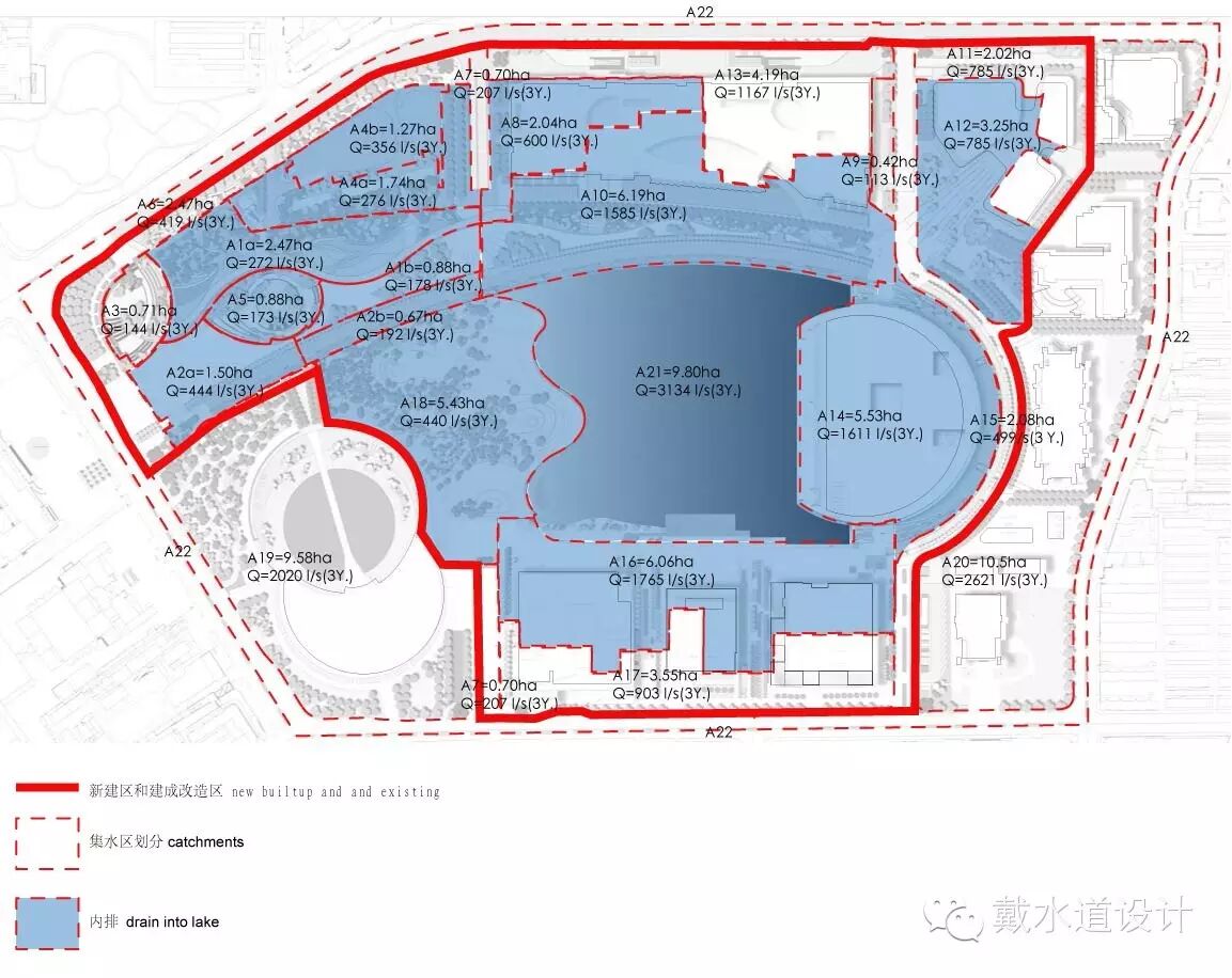 開發(fā)后地塊規(guī)劃情況見圖3--圖3.2,開發(fā)后場地中約56萬平方米為不透水新建區(qū),包括了43萬平方米硬質屋頂和鋪裝,如果不采用任何雨洪管理措施,勢必產生成倍洪峰,嚴重威脅這一城市核心地帶的安全。