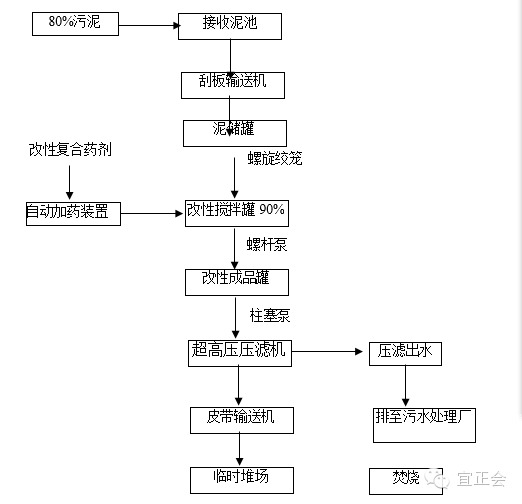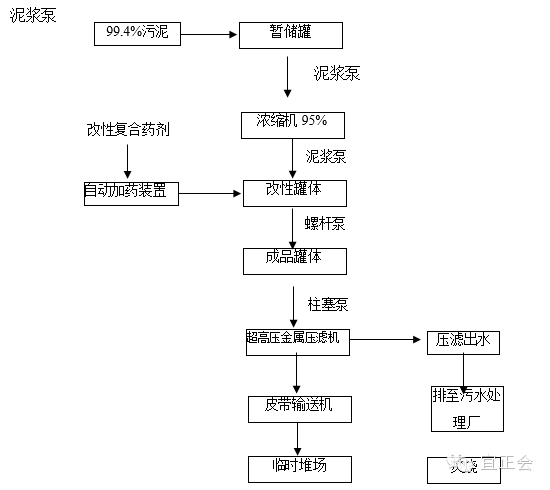 含水率80%~85%污泥經(jīng)泥池接收后由刮板輸送機(jī)輸送至原泥罐,通過出料角龍輸送給螺旋絞籠送至改性罐,改性藥劑由配套溶解攪拌設(shè)備調(diào)制后也輸送至改性罐,加入適量的水后攪拌,性好后由污泥輸送泵送至成品儲(chǔ)罐,再經(jīng)柱塞泵送至超高壓金屬壓濾機(jī),出機(jī)泥餅含水率為≤55%,泥餅由皮帶輸送機(jī)輸送至半干泥餅臨時(shí)堆場(chǎng),然后可焚燒。壓濾排出污水經(jīng)收集后外運(yùn)至污水處理站統(tǒng)一處理。