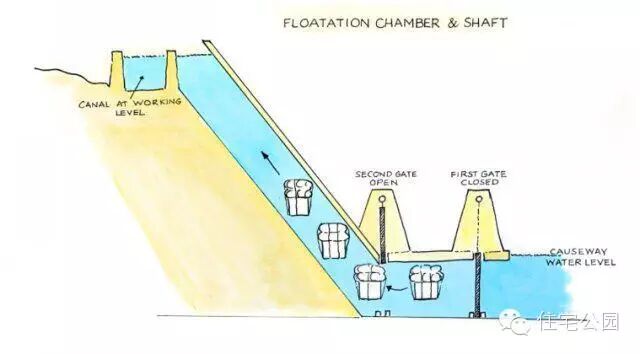 如圖所示:先關(guān)閉左邊的閘門,打開右邊的閘門,讓巨石進入隧道,然后關(guān)閉第一個門,打開第二個門,這樣在浮力的作用下,石材就會漂上去,同時,隧道內(nèi)的水不會下瀉,可以繼續(xù)利用。