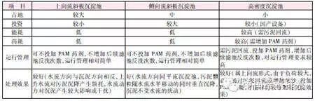 常用的深度處理沉淀工藝有平流沉淀池、斜板沉淀池、高密度沉淀池等。平流沉淀池抗沖擊負(fù)荷能力最強(qiáng),管理方便,運(yùn)行穩(wěn)定可靠,是升級(jí)改造工程的首選工藝,但由于其占地面積大,本工程無(wú)法采用。而斜板沉淀池采用淺層沉淀理論,通過(guò)設(shè)置多層斜板,增加沉淀面積,提高沉淀效率,減小占地面積。由于本工程占地非常緊張,因此只能在占地較小的側(cè)向流斜板沉淀池、上向流斜板沉淀池及高密度沉淀池之間進(jìn)行選擇。