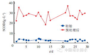圖2 半連續(xù)運(yùn)行過程中污泥預(yù)處理前后SCOD濃度的變化