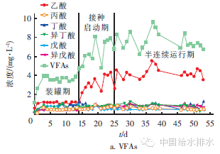 裝罐后第1天的VFAs濃度為1.13 g/L,第3天時(shí)上升到3.94 g/L,平均濃度為3.36 g/L,此后波動(dòng)不大。第14天進(jìn)入接種啟動(dòng)期,VFAs濃度明顯升高,平均濃度達(dá)到6.37 g/L。第25天進(jìn)入半連續(xù)運(yùn)行期,每天進(jìn)、排泥各3 m3。該階段的VFAs濃度有一定的波動(dòng),但總體維持在一個(gè)較高的水平,平均為7.63 g/L。從以上各運(yùn)行階段的有機(jī)酸濃度變化情況看,總體呈現(xiàn)逐漸上升的過程,并在進(jìn)入半連續(xù)運(yùn)行期后基本保持穩(wěn)定。從接入種泥后VFAs濃度迅速上升的趨勢可知,接入種泥對城市污泥厭氧發(fā)酵產(chǎn)酸起了明顯促進(jìn)作用。