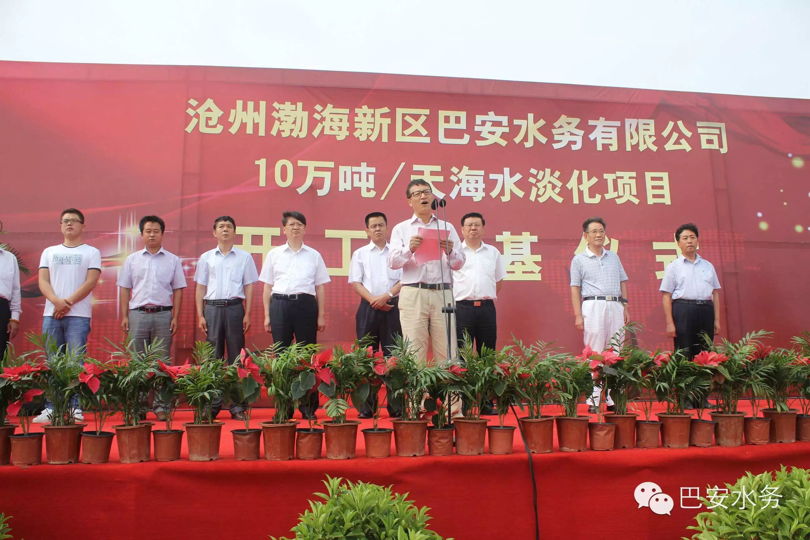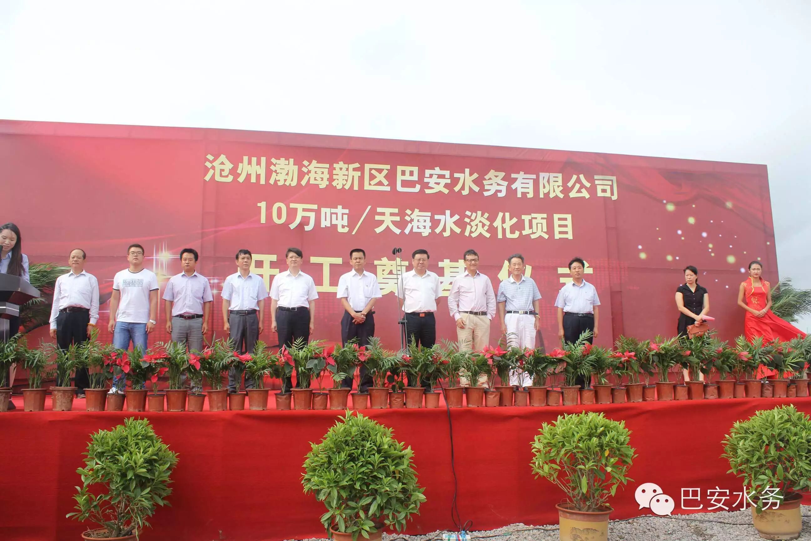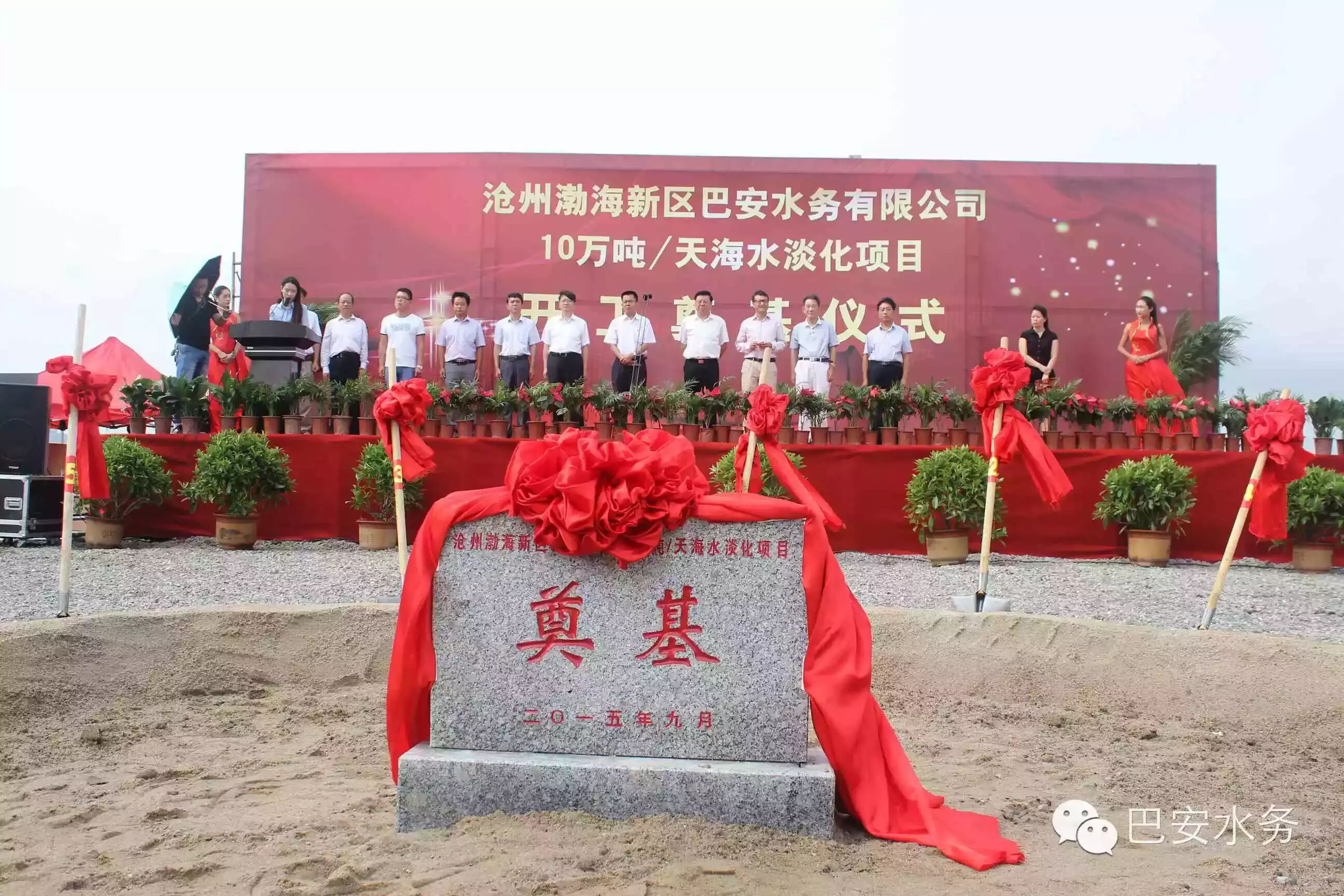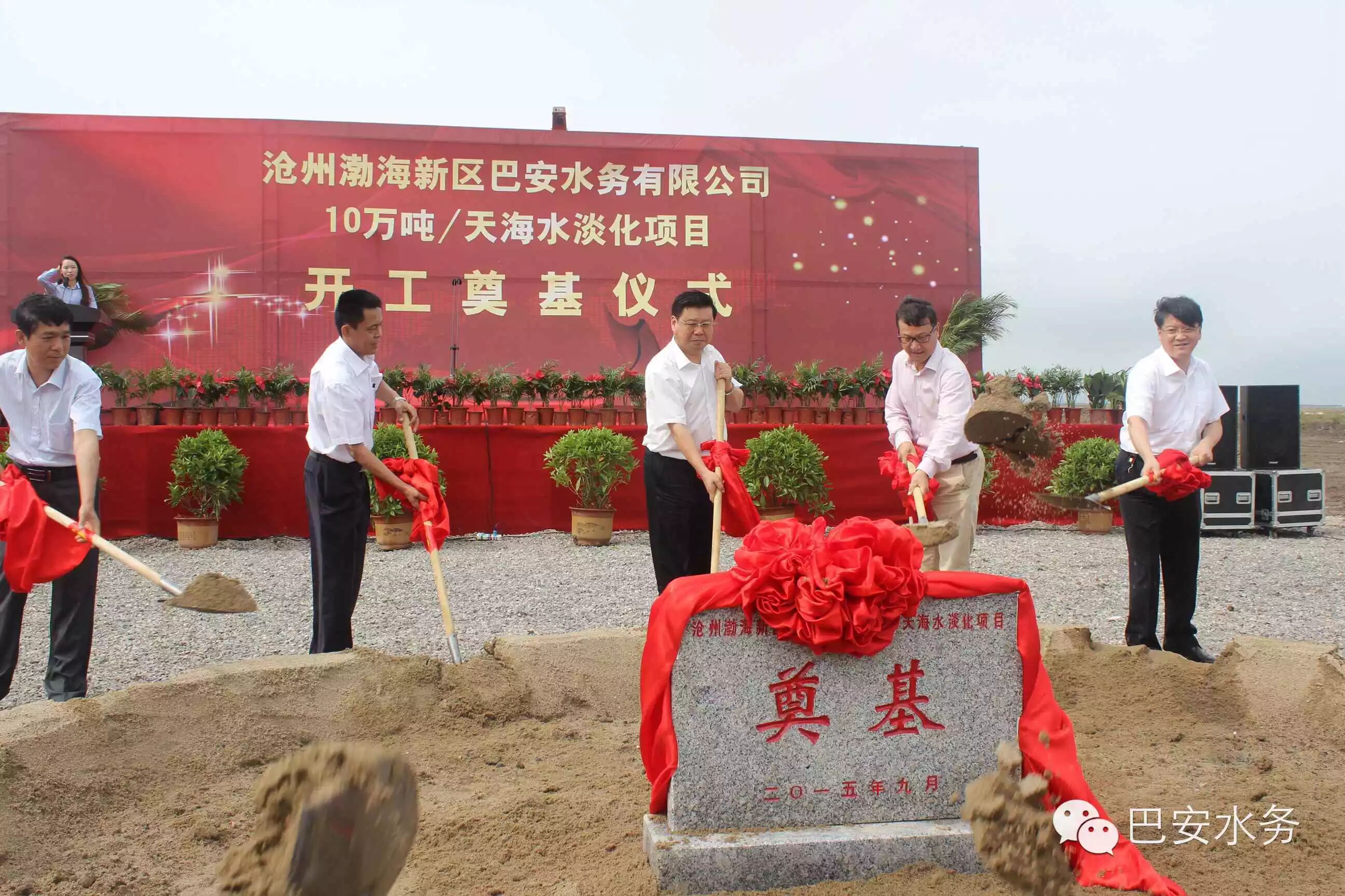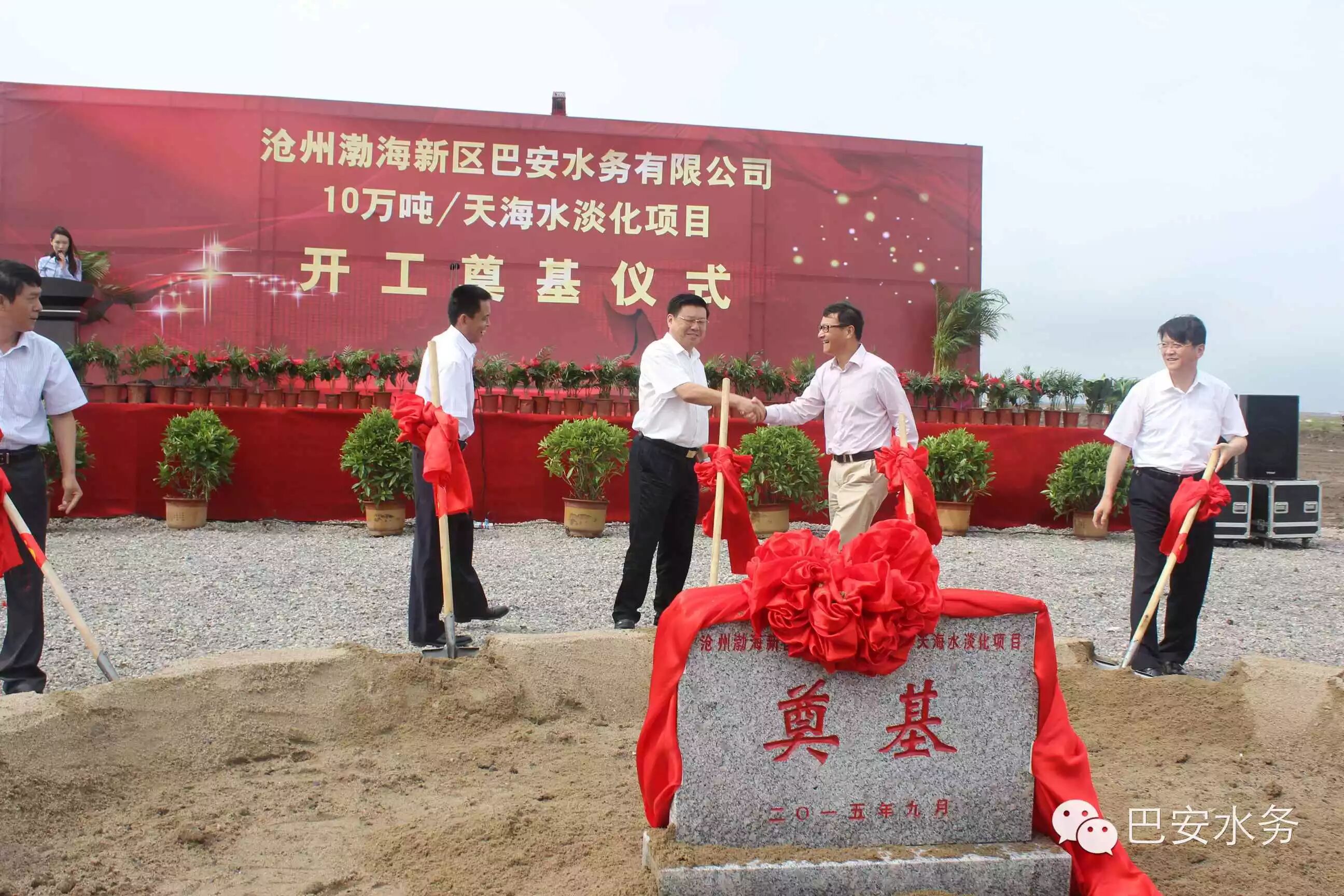2015年9月1日,滄州渤海新區(qū)巴安水務(wù)10萬噸/天海水淡化項(xiàng)目開工奠基典禮順利召開,巴安水務(wù)公司董事長張春霖、渤海新區(qū)管委會張國棟書記、張振民副主任及新區(qū)相關(guān)委辦局領(lǐng)導(dǎo)出席了開工奠基典禮。