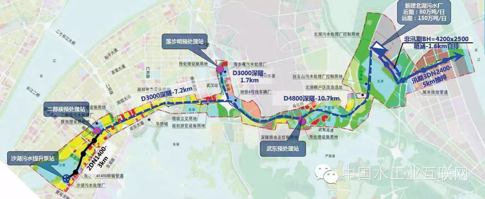 污水主隧道和雨水隧道起于二郎廟污水廠,沿沙湖大道和沙湖港敷設,至禮和路附近向南延伸至歡樂大道,再沿歡樂大道敷設至三環(huán)線,轉(zhuǎn)至武鄂高速公路至武東明渠排口,再經(jīng)嚴西湖和北湖公園內(nèi)敷設至北湖污水廠。污水支隧道起于落步咀污水廠,經(jīng)三環(huán)線東側(cè)綠化帶敷設至三環(huán)線青化立交入污水主隧道。