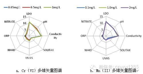 鉻()和錳()在多維矢量系統(tǒng)中具有不同的多維矢量圖譜,但不同濃度水平下其矢量圖一致,二者的主要影響參數(shù)分別為電導(dǎo)率和濁度、電導(dǎo)率和ORP,由此可實(shí)現(xiàn)對(duì)記憶污染物的識(shí)別。