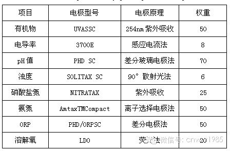 多維矢量水質(zhì)監(jiān)測(cè)預(yù)警系統(tǒng)利用水質(zhì)在線探頭對(duì)水質(zhì)數(shù)據(jù)進(jìn)行采集,根據(jù)原水水質(zhì)性質(zhì)設(shè)置有機(jī)物(CODUV)、電導(dǎo)率、pH值、濁度、硝酸鹽氮、氨氮、氧化還原電位(ORP)、溶解氧(DO)8個(gè)參數(shù)進(jìn)行模擬,探頭參數(shù)以不同權(quán)重(指標(biāo)在整體評(píng)價(jià)中的相對(duì)重要程度)擬合成觸發(fā)值(trigger),初始權(quán)重為系統(tǒng)自動(dòng)生成,屬于無量綱數(shù)值(如表1所示)。
