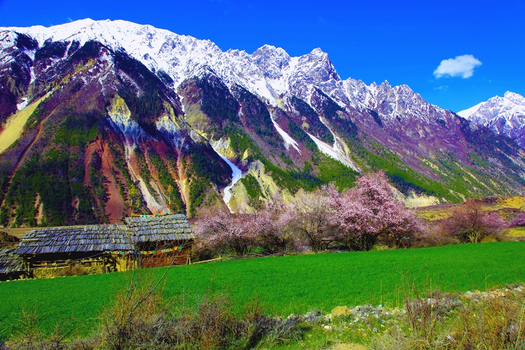在穿越川藏公路南線上,波密的出現(xiàn)會(huì)使你眼前一亮。這里位于雅魯藏布江東岸,3、4月份為桃花盛開的季節(jié),四周高聳的雪山包圍著波密小村莊,大片的桃花、油菜花、青稞把田野染得紅、黃、綠一片。這種韻味獨(dú)特的美,令人欣喜若狂。