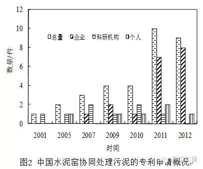 中國最早的專利是2001年由天津水泥工業(yè)設(shè)計研究院申請的“處理工業(yè)和生活污泥的方法”。該發(fā)明是將工業(yè)和生活污泥直接進入烘干機攪拌機烘干,烘干后的污泥送入流化床的懸浮爐;出爐物料經(jīng)旋風收塵器收下后直接進入水泥熟料燒成系統(tǒng)。該方法使污泥中的有機組分在燃燒中作熱值加以利用,細菌及惡臭氣體徹底燃盡,無機組分包裹在水泥熟料中,無二次污染。2007年以前,專利的申請單位主要集中于大學、設(shè)計院、科研院所等研究單位。隨著相關(guān)技術(shù)的應(yīng)用,企業(yè)申請專利的數(shù)量逐漸增多,發(fā)明內(nèi)容主要涉及相關(guān)設(shè)備的改進和發(fā)明方面(圖2)。