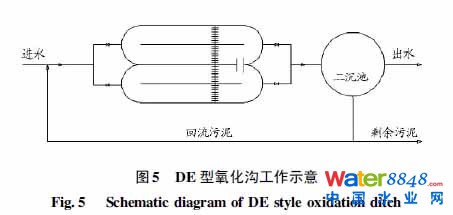 該類氧化溝系統(tǒng)設(shè)有單獨(dú)的二沉池,實(shí)現(xiàn)曝氣和沉淀的完全分離。最典型的半交替工作式氧化溝就是DE 型39 卷23 期 郭昌梓等 氧化溝的優(yōu)缺點(diǎn)及發(fā)展應(yīng)用型式 14289氧化溝。DE 型氧化溝是指由2 個(gè)相同容積的氧化溝組成的雙溝半交替工作系統(tǒng),具有良好的生物除氮功能。2 個(gè)氧化溝相互連通,串聯(lián)運(yùn)行,可交替進(jìn)出水,終沉池與氧化溝分建,有獨(dú)立的污泥回流系統(tǒng)。氧化溝內(nèi)曝氣轉(zhuǎn)刷一般為雙速,高速工作時(shí)為曝氣充氧,低速運(yùn)行時(shí)只推動(dòng)水流,不充氧。通過(guò)2 溝內(nèi)轉(zhuǎn)刷交替處于高速和低速運(yùn)行,可使2 溝交替處于缺氧和好氧狀態(tài),從而達(dá)到脫氮的目的( 圖5) 。它與D 型、T 型氧化溝不同之處是氧化溝與二沉池分開,有獨(dú)立的污泥回流系統(tǒng)。