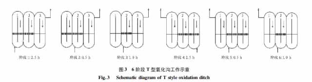 是3 溝交替運(yùn)行系統(tǒng)( 圖3) ,由3 個(gè)池容相同的氧化溝組建在一起,3溝連通,進(jìn)水交替進(jìn)入各溝,從兩側(cè)的邊溝出水,兩側(cè)氧化溝起曝氣和沉淀雙重作用,中間的氧化溝始終進(jìn)行曝氣,不設(shè)二沉池及污泥回流裝置,具有去除BOD5及硝化脫氮的功能。T 型氧化溝可按6 個(gè)或8個(gè)階段運(yùn)行,運(yùn)行周期一般為8 h。中溝始終作為曝氣池使用,側(cè)溝交替作為曝氣池和沉淀池運(yùn)行,提高了轉(zhuǎn)刷的利用率。