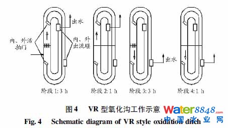 是單溝交替運(yùn)行系統(tǒng)( 圖4) ,其構(gòu)造特點(diǎn)是將氧化溝分成容積基本相等的2 部分,其間有單向活拍門相連,利用定時(shí)改變曝氣轉(zhuǎn)刷的旋轉(zhuǎn)方向來(lái)改變溝內(nèi)水流方向,使2 部分氧化溝交替地作為曝氣區(qū)和沉淀區(qū),不需設(shè)二沉池和污泥回流裝置。VR 型氧化溝有2 道單向活拍門和2 道出水堰,可實(shí)現(xiàn)連續(xù)進(jìn)水或間歇進(jìn)水。一般一個(gè)工作周期為8 h,分4 個(gè)階段,操作簡(jiǎn)便,機(jī)械設(shè)備少,出水水質(zhì)穩(wěn)定良好,其轉(zhuǎn)刷的實(shí)際利用率可達(dá)到75.0%。