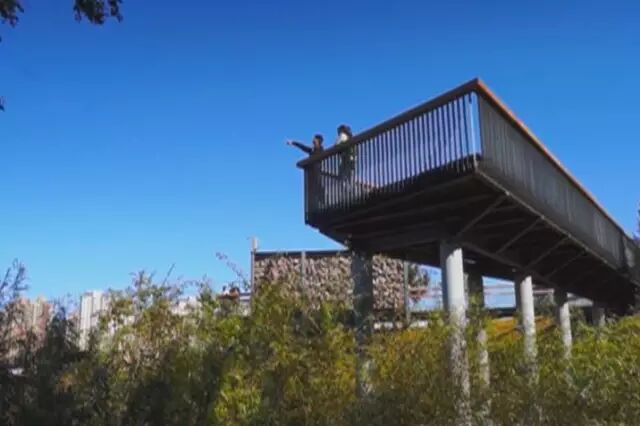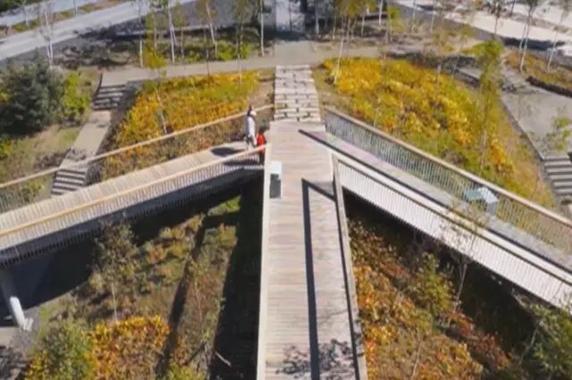 我們用了這套技術(shù),來(lái)解決城市內(nèi)澇的問(wèn)題。填挖土方,然后再把人放在這個(gè)上面去,做一條棧道,這個(gè)棧道放在海綿體之上。那么這個(gè)海綿體干嘛?吸收雨水,周邊的雨水,10倍于它范圍內(nèi)的雨水,都可以排到這公園里頭來(lái)。大家可以看到,排的過(guò)程中沉淀、凈化、過(guò)濾,然后補(bǔ)充地下水。”