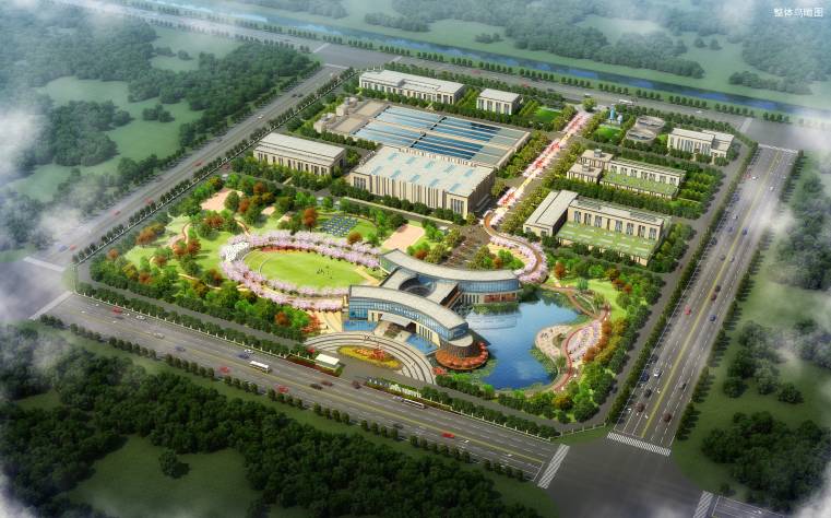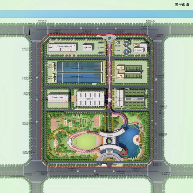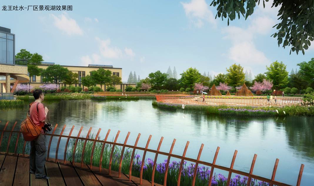 整個(gè)水廠總體布局以龍的造型為骨架,響應(yīng)中原的龍湖文化,廠區(qū)各構(gòu)筑物由北向南隨著龍的身體在兩側(cè)展開,象征龍的兩個(gè)翅膀,最終以廠前區(qū)的弧形綜合樓構(gòu)成龍首的意向,形成“應(yīng)龍吐水”意境。