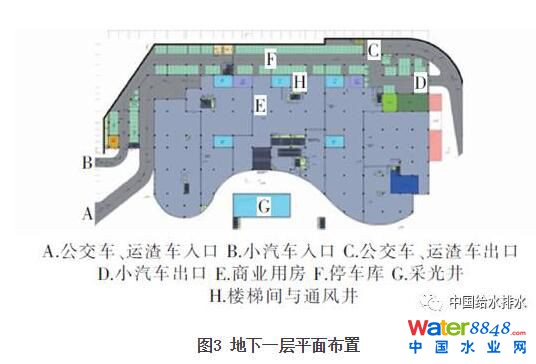 3.地下一、二層布局設計商業(yè)服務用房位于該大型綜合體的-1F南側。平面內柱網(wǎng)間距為8~15米,為商業(yè)后期靈活布局提供了有利的條件。平面內空間層高為6米,滿足一切商業(yè)用房的使用需要。平面內在中部位置設置有公交站的出入站門廳,并直通下沉式休閑廣場,沿下沉式廣場靈活布置設置商場出入口。