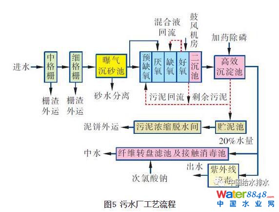 污水生化處理采用改良A2/O工藝、二沉池采用矩形周進周出沉淀池、污水深度處理采用高效沉淀池工藝、消毒采用紫外線消毒工藝;其中20%規(guī)模的中水再采用纖維轉盤濾池+次氯酸鈉輔助消毒。