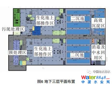 4.地下三、四層(污水廠)設計污水處理設計總規(guī)模6.0×104 m3/d,近期處理水量3.0×104 m3/d,遠期增加3.0×104 m3/d,土建一次實施,設備分期安裝。
