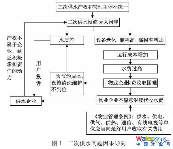 二次供水問題形成的原因有兩點:一是業(yè)主對于二次供水設施的管理缺失。二是二次供水維護主體的工作不力!段飿I(yè)管理條例》規(guī)定了供水企業(yè)對二次供水設施的管理責任,但囿于產權不屬于企業(yè)自身,且企業(yè)很難從二次供水設施的管理中獲得利潤,企業(yè)不愿意積極承擔養(yǎng)護責任。二次供水問題的因果導向見圖1。