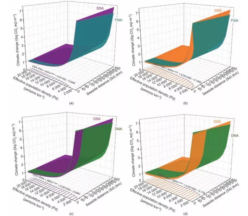 ▲ 基于氣候變化的敏感性分析:(a) DSAvs FWA; (b) DSS vs FWA; (c) DSA vs DNA; (d) DSS vs DNA.
