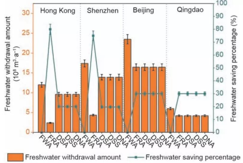香港和深圳從非本地淡水水源(東江)取水,北京通過長達1千多公里的南水北調(diào)來取水。下圖總結了4個城市在5種場景下的用水量情況。就淡水節(jié)省而言,理論上FRA的海水淡化可以取代所有非本地源的淡水使用,但這是不可持續(xù)的,所以在FRA場景中的淡水需求是指本地的淡水開采量,剩下的淡水需求都來自海水。從FWA和FRA的對比可以看出,香港和深圳的情況更加不安全,因為它們非常依賴非本地的水源。而在DSA、DSS和DNA三種用海水和中水沖廁的情境下,香港和深圳能節(jié)省的淡水只占20%-30%,因此SWTF和RWTF都不能滿足這兩座城市的用水需求,它們必須要從東江調(diào)入淡水。北京和青島使用海水/中水沖廁卻足夠緩解淡水短缺的問題,這顯示SWTF或者RWTF能夠完全消除它們對南水北調(diào)工程的依賴。