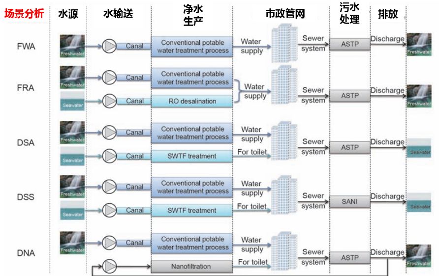 海水、淡水和集中式回用水被視作不同的城市供水類型。其他考慮因素包括了處理工藝、供水方式、污水收集的管網(wǎng)系統(tǒng)、根據(jù)水源要求的出水排放等。這個研究的目標定義為針對水資源緊缺城市的替代性水資源和污水處理方法的環(huán)境影響評估,計算單位是1m³的供水。
