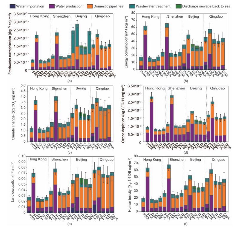 在這樣的背景下,香港科技大學研究團隊決定評估基于SWTF-SANI工藝的城市水系統(tǒng)的環(huán)境表現(xiàn),并于其他傳統(tǒng)系統(tǒng)做對比,例如應用了海水淡化系統(tǒng)來部分供應飲用水和/或中水沖廁(RWTF)的系統(tǒng),并進行了LCA分析,包含了水體富營養(yǎng)化、能耗、氣候變化、臭氧耗竭和土地使用。項目選取了深圳、香港、北京和青島作為研究對象——前兩個城市的水源來自東江,后兩者則以來南水北調(diào)工程。這些城市都面臨不同原因造成的水短缺問題。研究人員首先對這4個城市的6類環(huán)境影響類型在5個不同的城市水場景里作評估,然后進行敏感性分析找出最重要的影響因素,最后總結適合應用SWTF系統(tǒng)的情況。
