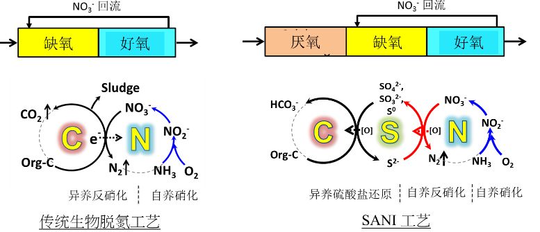傳統(tǒng)生物脫氮工藝(左)和SANI工藝(右)的概念比較