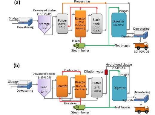 ▲ CambiTHP™(a) 和 Biothelys®(b)兩種熱水解工藝流程圖對比