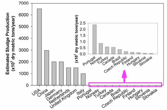 聯(lián)合國人居署的數(shù)據(jù)統(tǒng)計顯示,目前美國是污水污泥產(chǎn)量第一大國,中國和日本次之,年產(chǎn)干固污泥量分別為650、300和200萬噸。美國和日本的污泥處置率為94%和97%,其中在日本,超過一半的污泥都經(jīng)處理作為建筑材料回用,12%經(jīng)厭氧消化回收生物能。但是在中國的情況就比較堪憂,80%的污泥都沒有得到妥善處置,即使是填埋的污泥也可能未按照衛(wèi)生標(biāo)準(zhǔn)的60%含水率來處理,這給當(dāng)?shù)鼐用駧砹撕艽蟮陌踩[患。