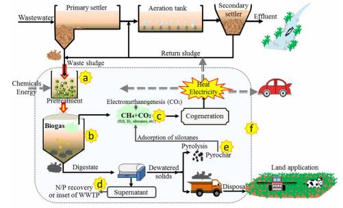 除了預(yù)處理之外,作者指出污泥處理也有關(guān)注資源回收的問題,例如將沼渣后處理提取有附加值的副產(chǎn)品,例如通過化學(xué)沉淀回收的鳥糞石,或者高溫?zé)峤馍筛邷靥?pyrochar)和活性炭。