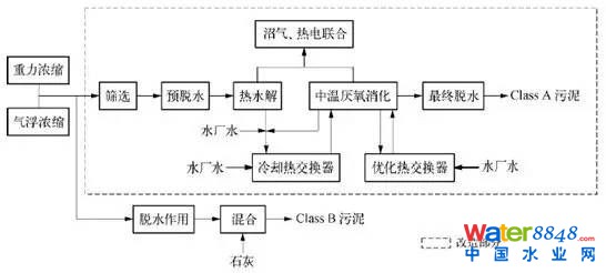 污泥處理處置系統(tǒng):為減少殘余污泥產(chǎn)量,提高剩余污泥質(zhì)量以達(dá)到EPAClassA標(biāo)準(zhǔn),并提升資源回收利用率,使污泥處理系統(tǒng)實(shí)現(xiàn)綜合供熱供電,BluePlains污水廠對(duì)濃縮后的污泥進(jìn)行熱水解處理,成為北美第一個(gè)采用污泥熱水解的污水處理廠,在當(dāng)時(shí)成為世界上最大的污泥熱水解裝置,其處理工藝如圖所示。